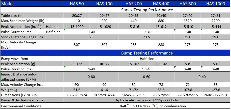 TestSmart HAS series horizontal impact testers are used to simulate the horizontal shock effects of rail switching, truck docking, and other types of high G short duration horizontal impacts. With payload capacities from 100lbs to 2,200lbs and over 1,000g capability, TestSmart has the right machine for your application. The horizontal shock machines can also be used for high-cycle bump testing applications.