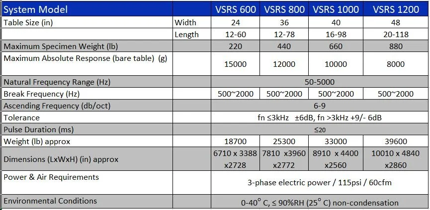 The VSRS series pneumatic shock response spectrum test machine is used to characterize maximum product response. Application can confirm product fragility limits, meet specifications, determine design margins, and packaging effectiveness. SRS testing has become a commonplace test in the aviation, aerospace, military-related research applications. SRS yields a ‘fingerprint’ of maximum product response to a base transient input.
